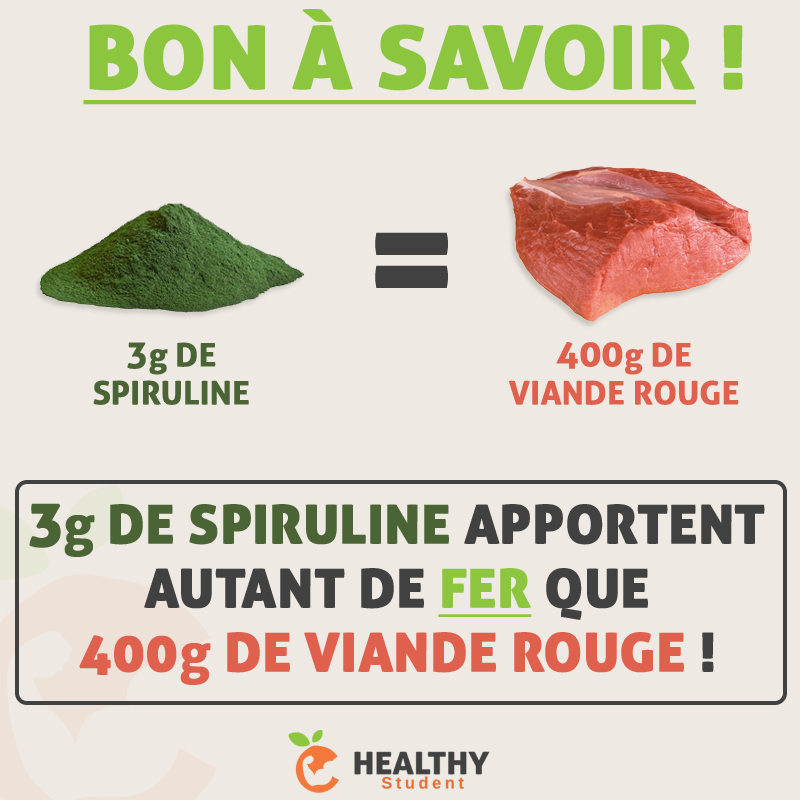 Deuxièmement, la spiruline est extrêmement riche en fer : 100 fois plus que les épinards et 50 fois plus que la viande rouge. 10 grammes de cette algue microscopique suffisent à combler les besoins quotidiens d'un adulte moyen !